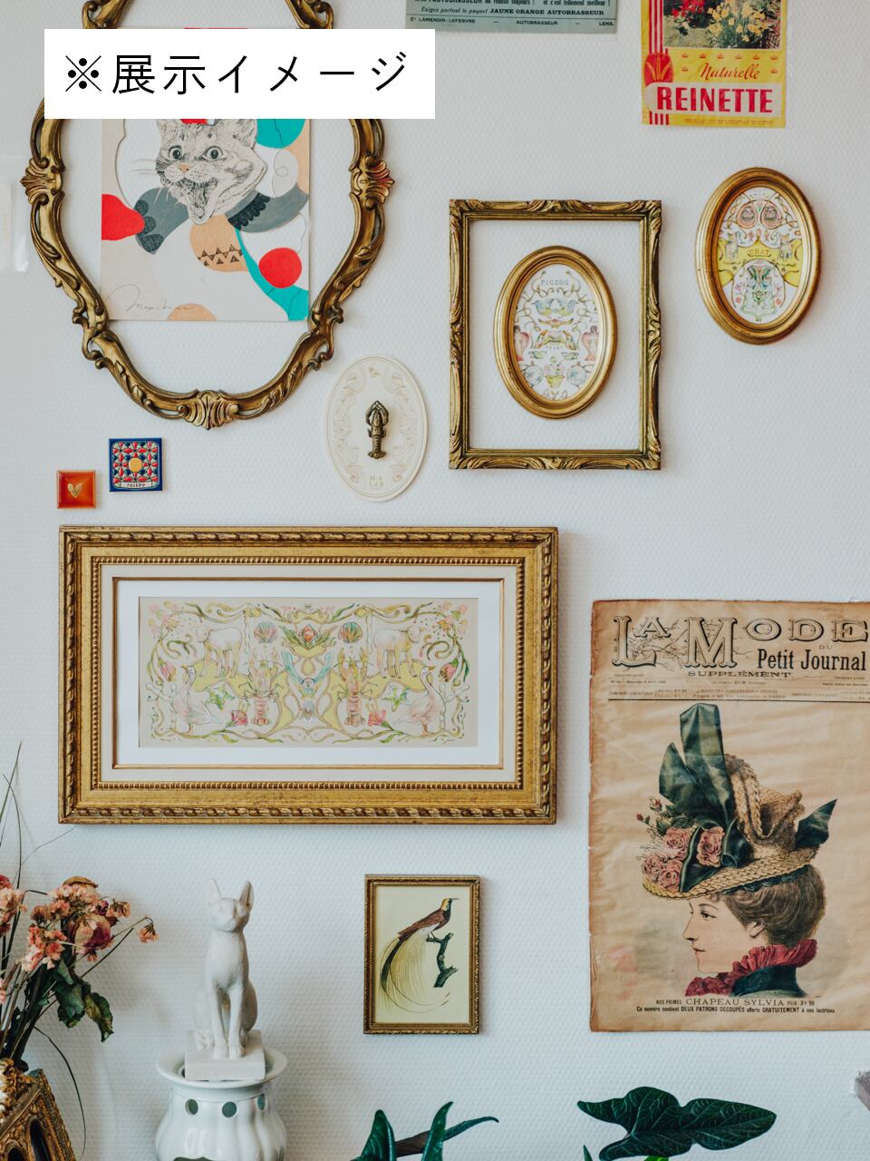 こちらの作品は、すべて描き下ろしのフルカラーイラストを、フランスの蚤の市で見つけたヴィンテージの額に額装したものです。