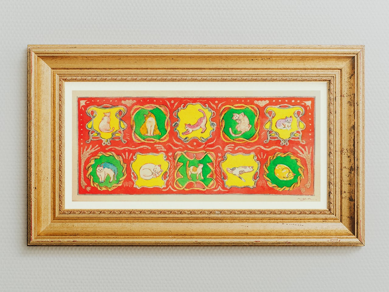 ヴィンテージのゴールドの額が持つ魅力を活かし、空間に溶け込むようなカラフルで調和のとれた色合いに仕上げました。お部屋にさりげなく彩りを添え、日常を少しだけ華やかに演出できたら嬉しいです。